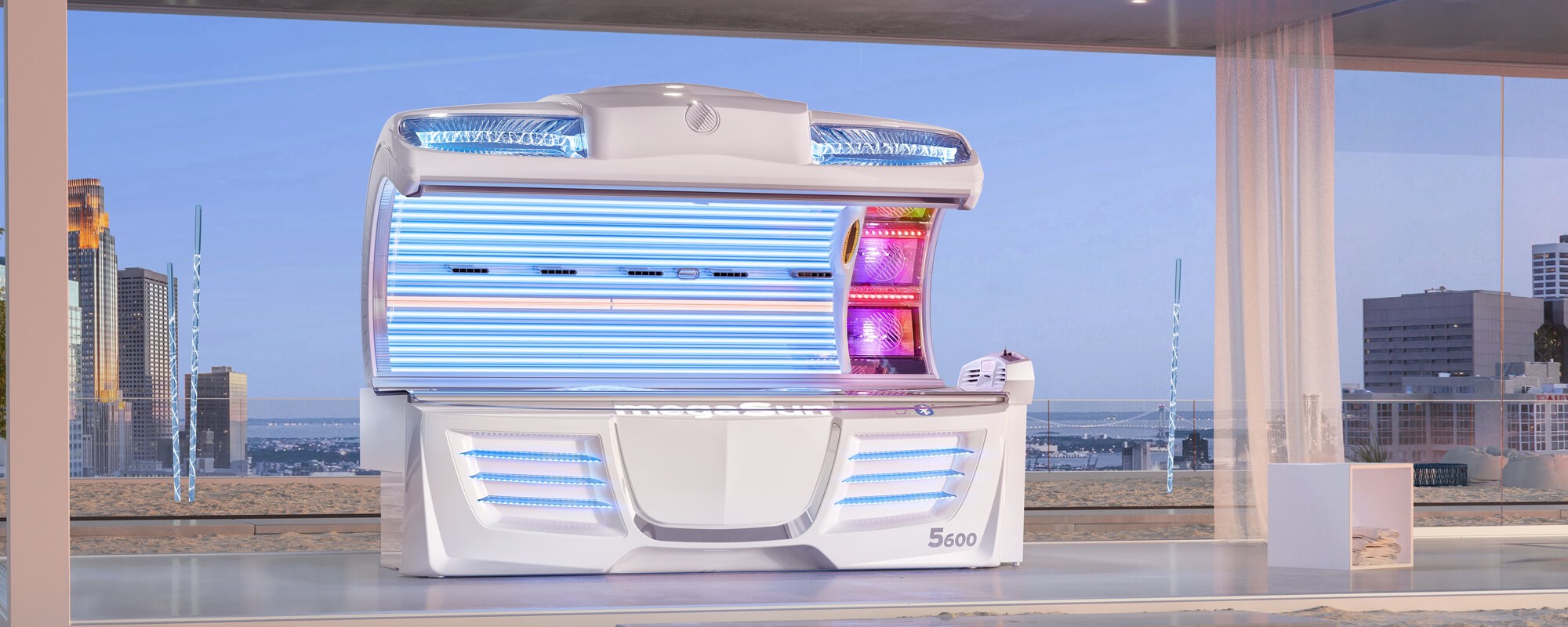 Spacious, dynamic and easy to use, the Megasun 5600 is a stunning addition to our salon. Dynamic LED’s mounted on the front panel welcome you with a specifically chosen range of colours that enhance the refined details of this beautiful sunbed. With 26 lamps in the canopy including 2 p2 tubes, 16 in the base and 4 dedicated facial tanners, the 5600 is an exceptional unit.